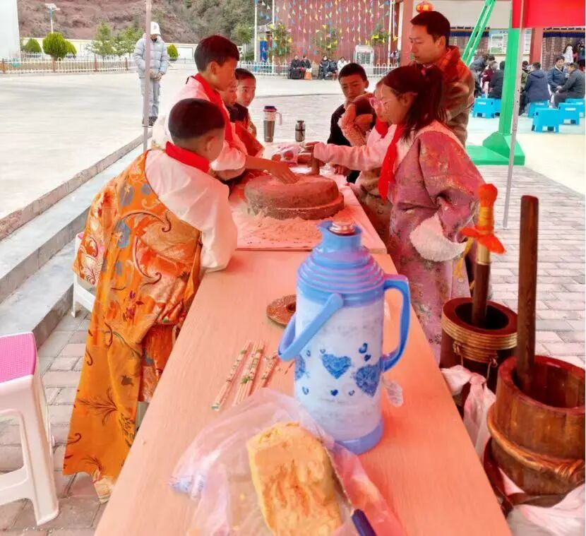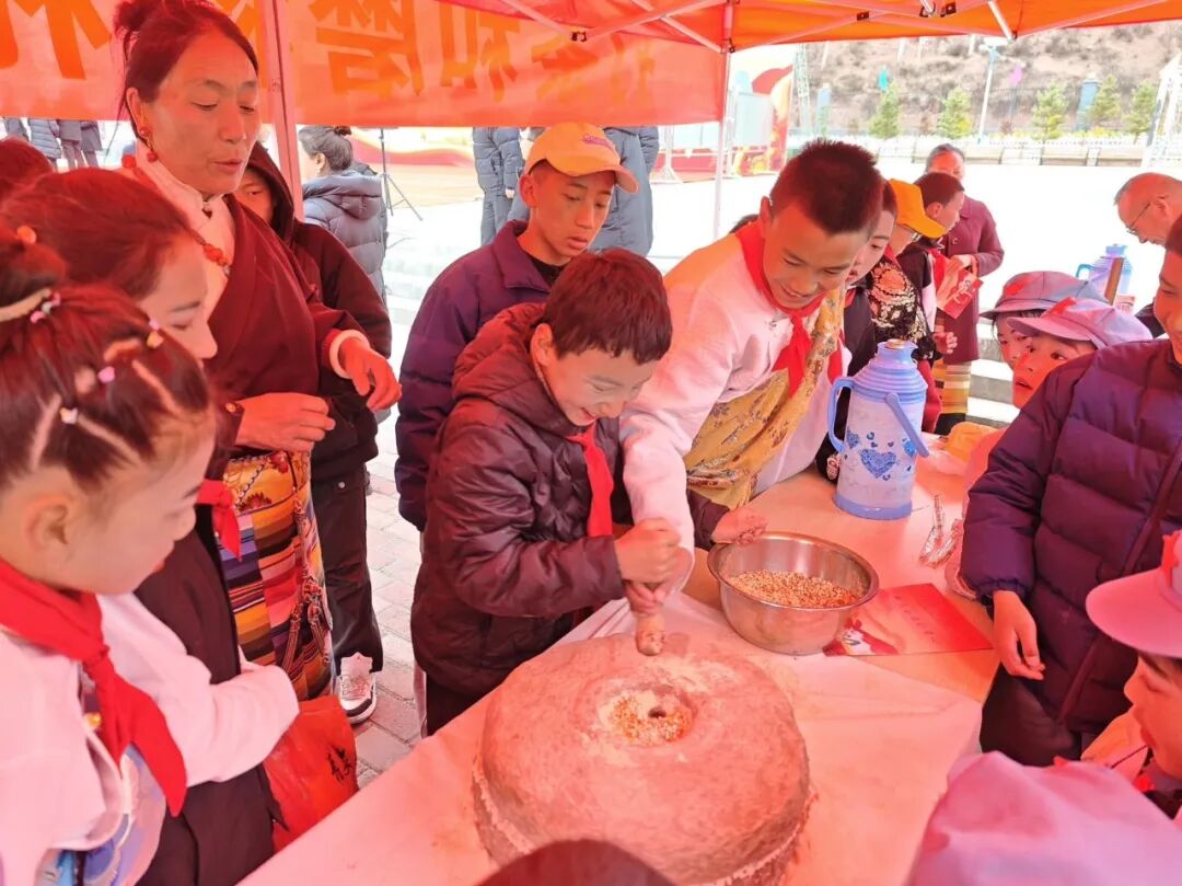 打茶和磨糌粑体验区更是充满烟火气,孩子们在党员干部的手把手指导下,亲手学习打酥油茶、手磨糌粑,在动手实践中体会劳动的快乐与价值,深刻理解“幸福生活源于劳动创造”的道理,将感恩之心融入每一个实践细节。