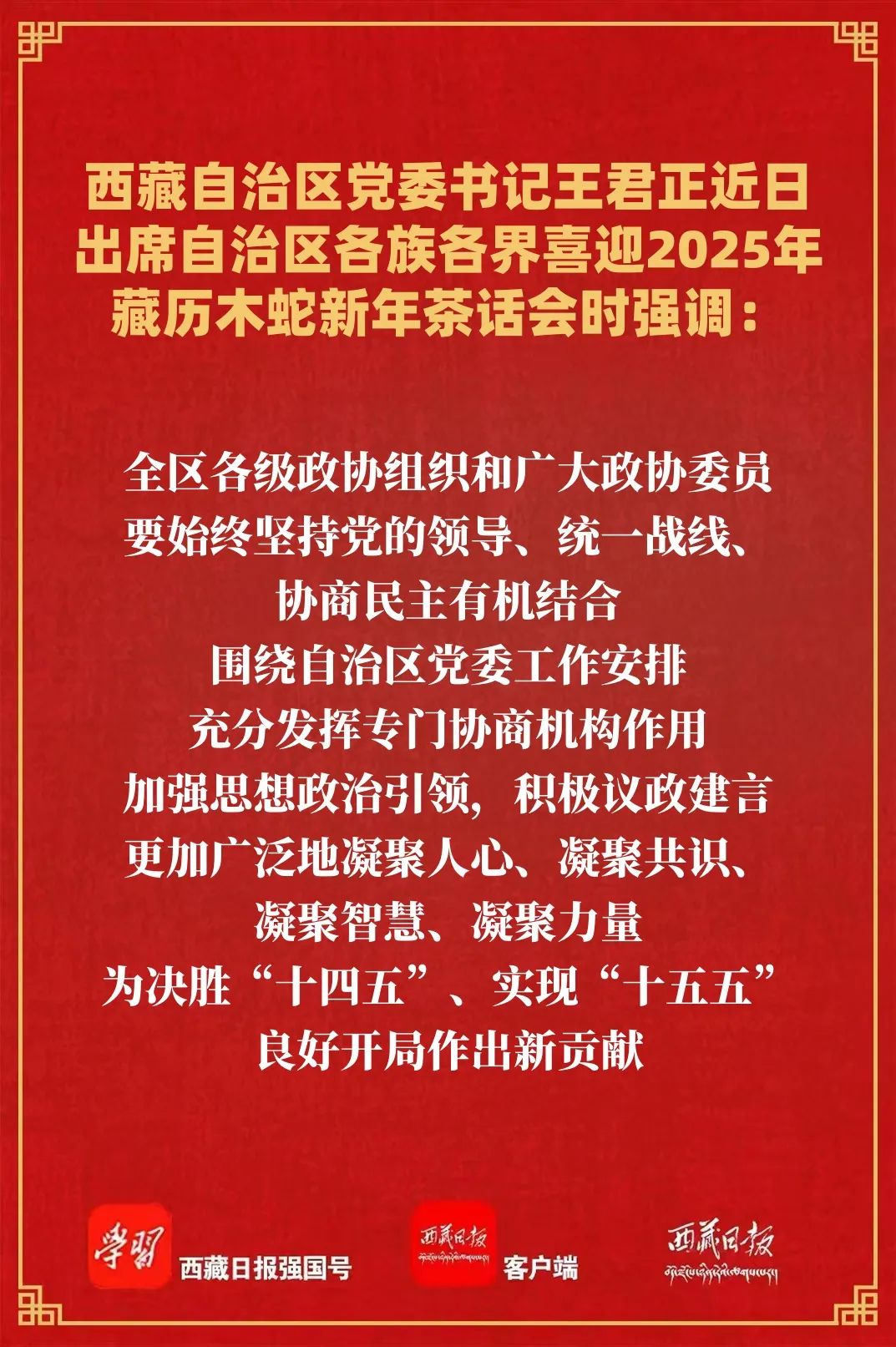 王君正强调,2025年是“十四五”规划收官之年,也是自治区成立60周年。我们要认真贯彻落实习近平总书记关于西藏工作的重要指示和新时代党的治藏方略,聚焦“四件大事”聚力“四个创建”,恪尽职守、努力工作,切实把习近平总书记对西藏的关怀关爱转化为团结奋斗、干事创业的强大动力。全区各级政协组织和广大政协委员要始终坚持党的领导、统一战线、协商民主有机结合,围绕自治区党委工作安排,充分发挥专门协商机构作用,加强思想政治引领,积极议政建言,更加广泛地凝聚人心、凝聚共识、凝聚智慧、凝聚力量,为决胜“十四五”、实现“十五五”良好开局作出新贡献。