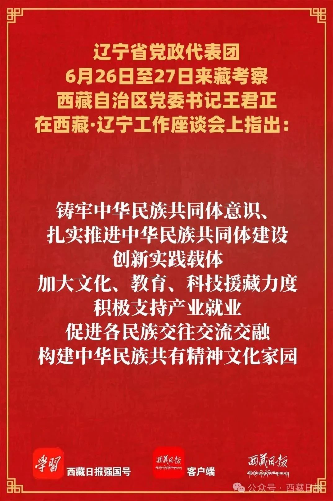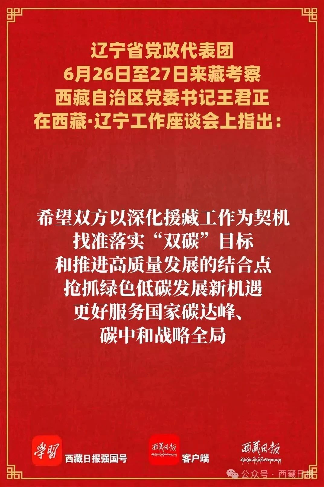 座谈会上,王君正代表自治区党委、政府对辽宁省党政代表团来藏考察表示欢迎,向辽宁长期以来给予西藏工作的支持表示感谢。他说,辽宁作为我国重要的工业基地,为强国建设、民族复兴作出了积极贡献。近年来,辽宁认真学习贯彻习近平总书记重要指示精神,在东北振兴中走在前、作表率,实现了“四个重大转变”“六个新提升”,成绩让人自豪、令人钦佩。我们要认真学习辽宁落实国家重大战略的政治担当、勇于争先率先突破的典型做法、对外开放的先进经验和干部实干争先的优良作风,努力运用到西藏经济社会发展的实践中去。西藏在党和国家工作大局中具有十分重要的战略地位。党的十八大以来,以习近平同志为核心的党中央高度重视西藏工作,习近平总书记多次作出重要指示批示,确立了新时代党的治藏方略,明确了“稳定、发展、生态、强边”四件大事,提出了长治久安和高质量发展的战略目标,部署了加快建设社会主义现代化新西藏的战略任务。今天的西藏,社会稳定、经济发展、民族团结、宗教和睦、生态良好、边防巩固、人民安居乐业,呈现出一派欣欣向荣的良好景象。西藏的发展进步充分彰显了坚持党的领导和社会主义制度的政治优势和巨大优越性,充分彰显了习近平总书记关于西藏工作的重要指示和新时代党的治藏方略的英明正确,也离不开包括辽宁人民在内的全国人民的大力支援。6月26日至27日,辽宁省党政代表团来藏考察。这是在藏期间,辽宁省党政代表团到拉萨市那曲第二高级中学调研。记者 白玛泽旺 摄王君正指出,中华民族大家庭血脉相连、命运与共。我们要共同学习贯彻习近平总书记重要指示精神,努力推动两地经济社会高质量发展。铸牢中华民族共同体意识、扎实推进中华民族共同体建设,创新实践载体,加大文化、教育、科技援藏力度,积极支持产业就业,促进各民族交往交流交融,构建中华民族共有精神文化家园。扬长避短、推动经济高质量发展,希望辽宁发挥我国重要工业基地作用和科技产业优势,推动清洁能源、高原轻工业等产业发展,推动科技成果转化为现实生产力,更好把西藏资源优势转化为经济优势、发展优势。关注民生建设、增强群众获得感幸福感安全感,围绕人口、人心、人才等深层次问题,聚焦群众最关心最直接最现实的利益问题,从“关键小事”入手,办好“民生大事”,夯实党在西藏的执政根基。加大援藏工作力度、推进生态文明建设,西藏自然资源丰富、清洁能源富集,有条件有责任有能力为“双碳”目标作贡献,希望双方以深化援藏工作为契机,找准落实“双碳”目标和推进高质量发展的结合点,抢抓绿色低碳发展新机遇,更好服务国家碳达峰、碳中和战略全局。6月26日至27日,辽宁省党政代表团来藏考察。这是在藏期间,辽宁省党政代表团到拉萨市那曲第二高级中学调研。记者 白玛泽旺 摄今年是西藏自治区成立60周年。郝鹏代表辽宁省委、省政府对60年来西藏在党的领导下取得的辉煌成就,特别是新时代以来各项事业取得的全方位进步表示热烈祝贺,对西藏自治区给予辽宁振兴发展的大力支持和对援藏干部人才的关心爱护表示衷心感谢。他说,习近平总书记高度重视西藏工作,亲自为西藏工作把舵定向、指引方向,确立了新时代党的治藏方略,为做好新时代西藏工作提供了根本遵循。自治区党委深入贯彻习近平总书记关于西藏工作的重要指示和新时代党的治藏方略,团结带领全区各族干部群众,聚焦“稳定、发展、生态、强边”四件大事,深入推进“四个创建”,推动长治久安和高质量发展迈出了坚实步伐,雪域高原处处呈现出欣欣向荣的良好景象。这些充分彰显了以习近平同志为核心的党中央的英明领导,充分证明了新时代党的治藏方略的无比正确,充分体现了中国特色社会主义制度无可比拟的巨大优越性,充分展现了西藏各族人民战天斗地、改天换地的豪情壮志。6月26日至27日,辽宁省党政代表团来藏考察。这是在藏期间,辽宁省党政代表团到西藏博物馆调研。记者 白玛泽旺 摄郝鹏指出,习近平总书记亲自部署、亲自推动援藏工作,强调必须长期坚持,认真总结经验,开创援藏工作新局面。辽宁坚决贯彻习近平总书记重要指示精神和党中央决策部署,将对口援藏工作作为重大政治任务,推动对口支援持续巩固拓展,交流合作不断深化提升,两省区结下了山海情长的深厚情谊,取得了实打实的丰硕成果。我们将坚决扛牢对口援藏工作的政治责任,全面落实新时代党的治藏方略,立足西藏所需、辽宁所能、群众所盼,扎实谋划,大力推进,持续做精产业援藏,推动更多优质项目落户发展,持续做深智力援藏,培养更多能干事、留得下、带不走的干部人才队伍,持续做实民生援藏,让群众更加可感可及、得到更多实惠,奋力推动新时代对口援藏工作不断迈上新台阶,书写“辽藏一家亲”新篇章。当前,辽宁正深入学习贯彻习近平总书记在辽宁考察时的重要讲话精神,全力实施全面振兴新突破三年行动,在首战告捷、攻坚连胜的基础上,坚决打好打赢决胜之年决胜之战。希望两省区以对口援藏为牵引,进一步深化交流合作,共同拓展各民族交往交流交融的广度深度,推动产业融合发展,强化产学研用一体化协同创新,加强生态环境保护互鉴互动,开展文旅资源开发合作,齐心协力为推进中国式现代化建设贡献更大力
