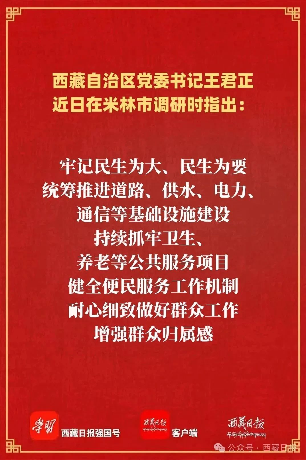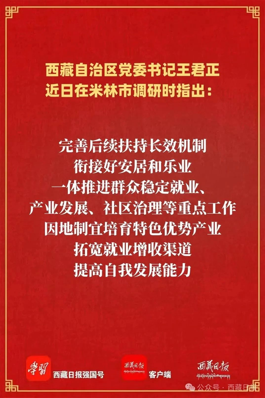 近日,自治区党委书记王君正在米林市调研时强调,要全面贯彻党中央大政方针和自治区党委决策部署,关心群众生产生活,注意工作方式方法,做好国家重大工程服务工作,扎实推进乡村全面振兴,让现代化建设成果更多更好惠及农牧民群众。