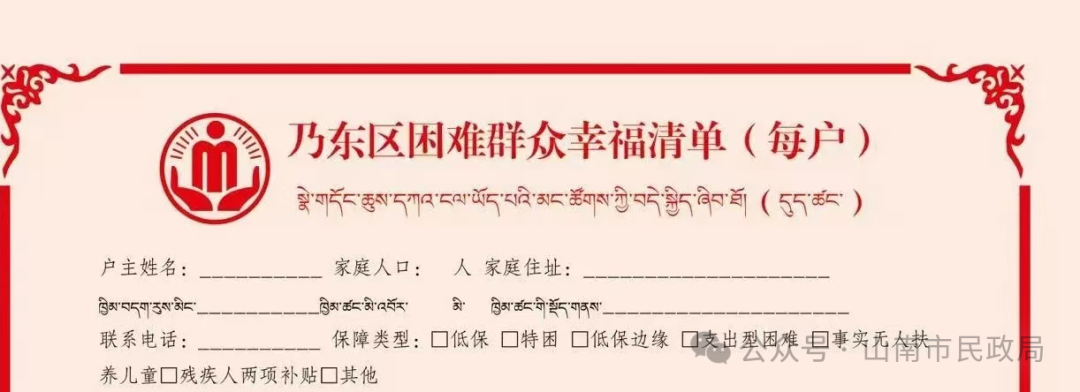 山南市困难群众类型多元、分布广泛,此前部分群众普遍面临“政策看不懂、待遇说不清、资金查不到”的现实难题,民政救助政策知晓率与保障精准度未能完全匹配群众需求。为彻底破解这一民生堵点,打通政策落地“最后一公里”,山南市民政部门践行“民政为民、民政爱民”理念,立足工作实际,以精细化、便民化为导向,围绕“清单到户、政策到人、监督到位”要求,推行藏汉双语版困难群众幸福清单入户张贴服务,将暖心清单送到群众家门口,把党和政府的民生关怀精准送达每一户困难群众家中,切实提升群众的获得感、幸福感与安全感。